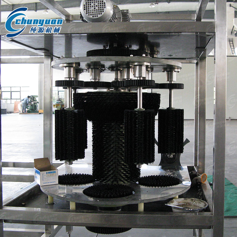 全自動(dòng)外刷桶機(jī)由不銹鋼機(jī)架、封板(不銹鋼〉、主旋轉(zhuǎn)毛刷、毛刷調(diào)速電機(jī)、撥輪調(diào)速電機(jī)、捅底部旋轉(zhuǎn)毛刷、撥輪結(jié)構(gòu)、 沖洗水泵、噴淋室等組成。全自動(dòng)外刷桶機(jī)采用優(yōu)質(zhì)不銹鋼制作,耐腐蝕,易清洗。主要?dú)饴吩捎门_(tái)灣亞德克產(chǎn)品,該機(jī)結(jié)構(gòu)緊湊, 工作效率高且穩(wěn)定可靠,自動(dòng)化程度高,操作簡(jiǎn)單。