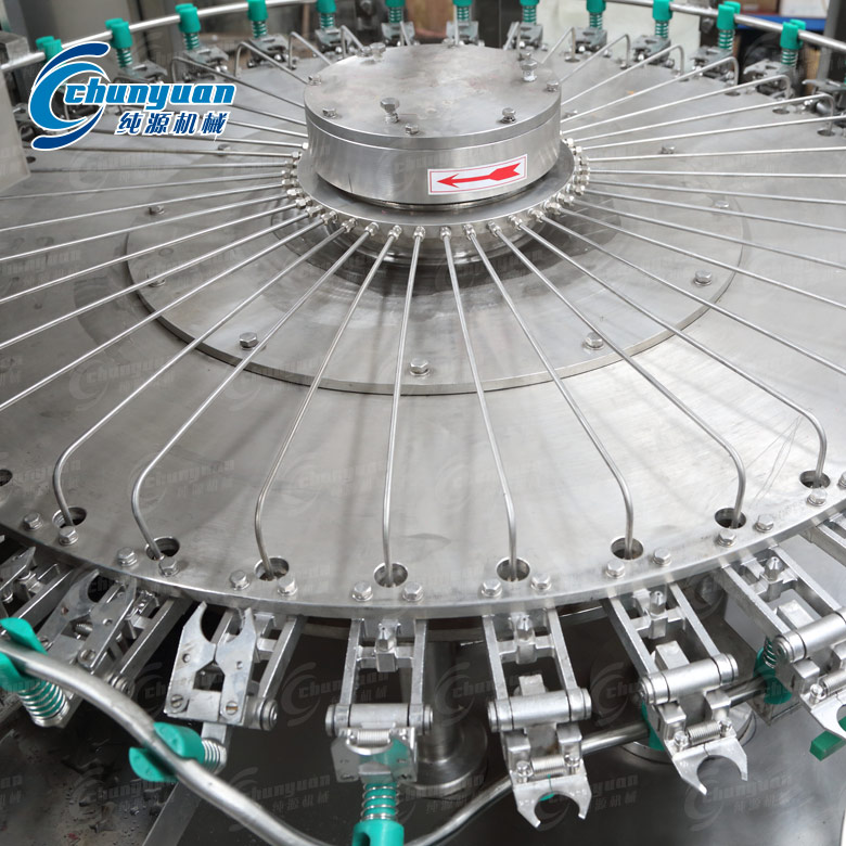 PET瓶由分瓶星輪進(jìn)入設(shè)備由夾鉗和翻轉(zhuǎn)機(jī)構(gòu)夾住瓶口轉(zhuǎn)至瓶口朝下,無菌水沖洗后瀝干,自動翻轉(zhuǎn)至瓶口朝上,經(jīng)出瓶星輪輸送至灌裝機(jī)。設(shè)備主要結(jié)構(gòu)與沖洗介質(zhì)接觸部分和外部防護(hù)罩均為優(yōu)質(zhì)不銹鋼材料;開放式齒輪傳動。