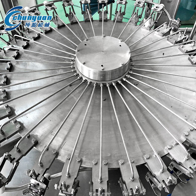 小瓶裝三合一純凈水設(shè)備。進(jìn)入灌裝機(jī)的瓶子由瓶頸托板卡住并在凸輪作用下將瓶子上升,然后由瓶口將灌裝閥頂開(kāi)。灌裝采用重力灌裝方式。灌裝閥打開(kāi)后物料通過(guò)灌裝閥完成灌裝過(guò)程,灌裝結(jié)束后瓶口下降離開(kāi)灌裝閥,瓶子通過(guò)卡瓶頸過(guò)渡撥輪進(jìn)入旋蓋機(jī)。